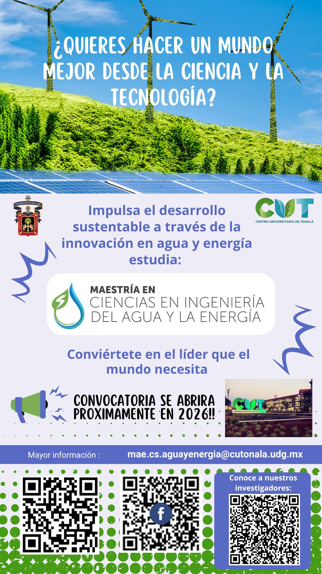 La Maestría en Ciencias en Ingeniería del Agua y la Energía tiene por objeto cubrir las demandas creadas por el sector productivo, social académico y principalmente científico y tecnológico, en el estado de Jalisco, como en el resto de estados de la República Mexicana. Se formarán profesionistas altamente capacitados que participen en el ámbito de la docencia y que tendrán la capacidad de desarrollar ideas que coadyuven en la generación de nuevo conocimiento y aplicación del conocimiento.