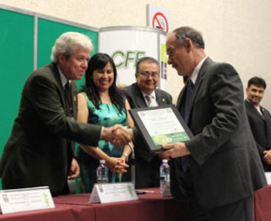 ,Dicho reconocimiento se le fue entregado en la clausura del Congreso en las instalaciones de la Expo Guadalajara en manos de la maestra Mónica Maricela Reyes Garrido, directora general de Mejoramiento Ambiental en representación del C. Emilio González Márquez, Gobernador Constitucional del Estado de Jalisco y del Ing. Eduardo Calderón Reynoso presidente del Colegio de Ingenieros Mecánicos Electricistas del Estado de Jalisco.
