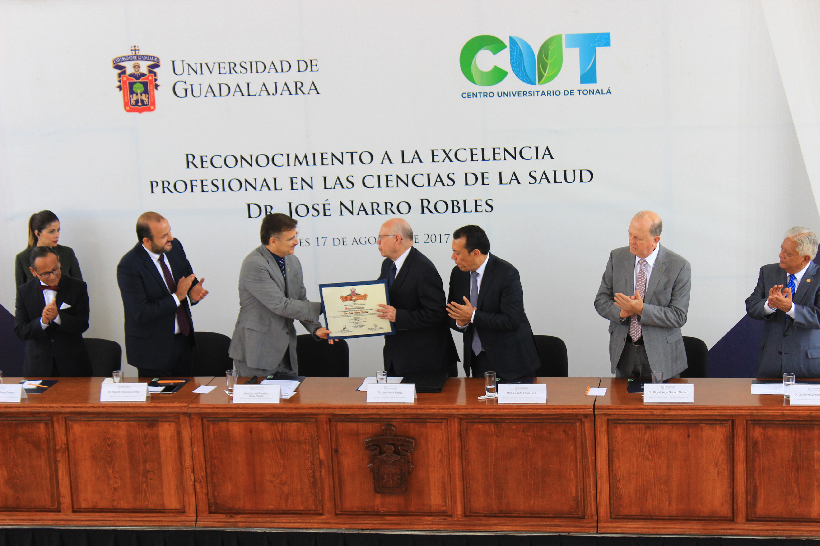 El rector general de la Universidad de Guadalajara, Mtro. Itzcóatl Tonatiuh Bravo Padilla entregó esta mañana el reconocimiento al mérito profesional en salud al Dr. José Narro Robles por su destacada trayectoria en la rama de las ciencias de la salud; este reconocimiento se dio en el marco de la ceremonia de iniciación de los alumnos de primer semestre de la carrera de medicina del Centro Universitario de Tonalá.