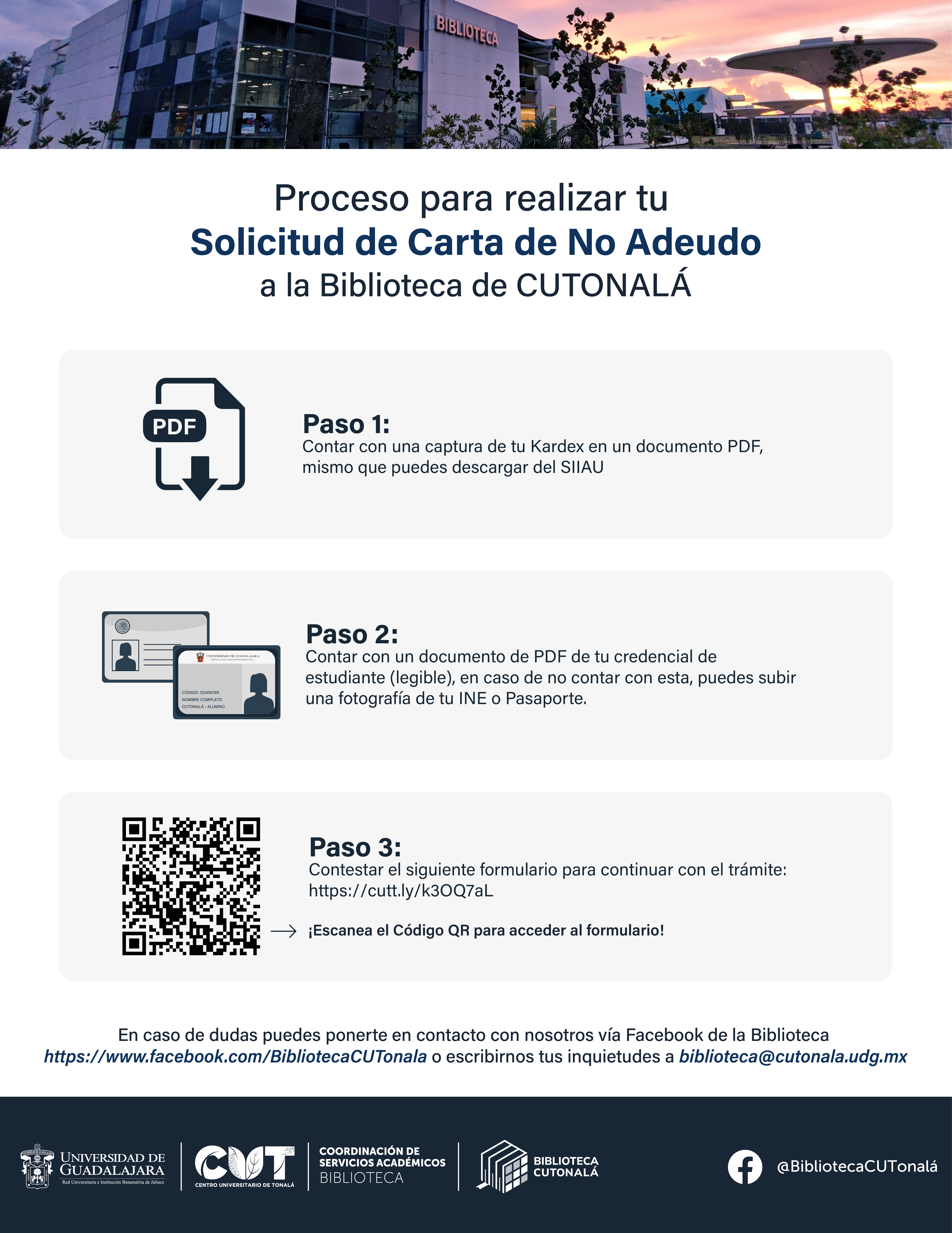 Para tramitar tu Carta de No Adeudo a la Biblioteca del CUTonalá es necesario que cuentes con imágenes en PDF tanto de tu Kardex de estudiante como de tu credencial UdeG, para posteriormente llenar el formulario: