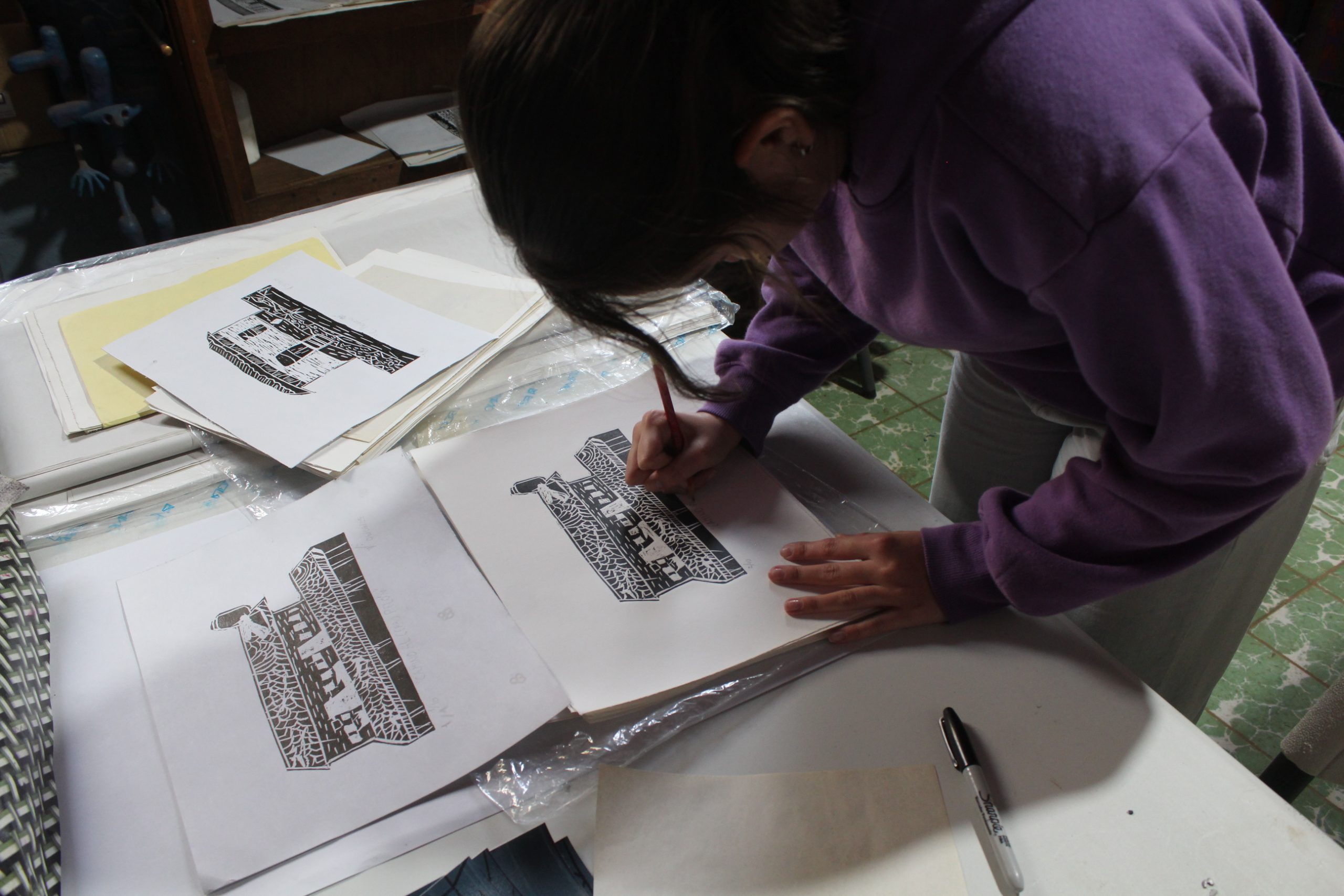 , “Aquí lo interesante es que con base a la técnica del grabado se hacen registros gráficos de fachadas y técnicas constructivas que existen en el pueblo. Busco que los jóvenes, desde su punto de vista, empiecen a generar esta información para que tengan esa conexión con su patrimonio”, detalló.