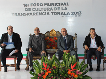 ,En representación del Lic. Jorge Arana Arana, Presidente Municipal de Tonalá, estuvo el Lic. Gregorio Ramos Acosta, Síndico del Ayuntamiento, quien en compañía de la Dra. Ruth Padilla Muñoz, Rectora del CUTonalá y de diversos funcionarios públicos, se dieron por inaugurados los trabajos del primer Foro Municipal de la Cultura de Transparencia.