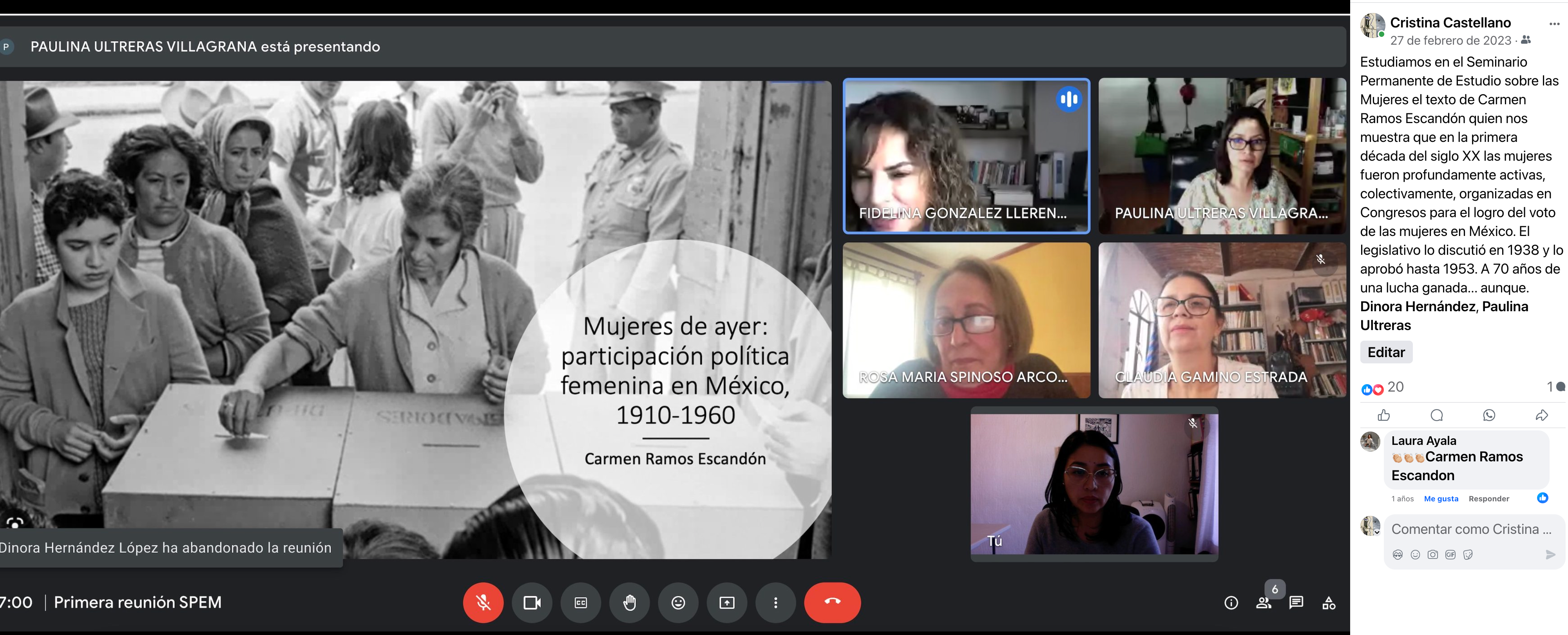 • 27 de febrero de 2023. Discusión de la lectura de Carmen Ramon Estandón, Mujeres de Ayer: participación política femenina en México 1910-1960. Comentó: Paulina Ultreras Villagrana.