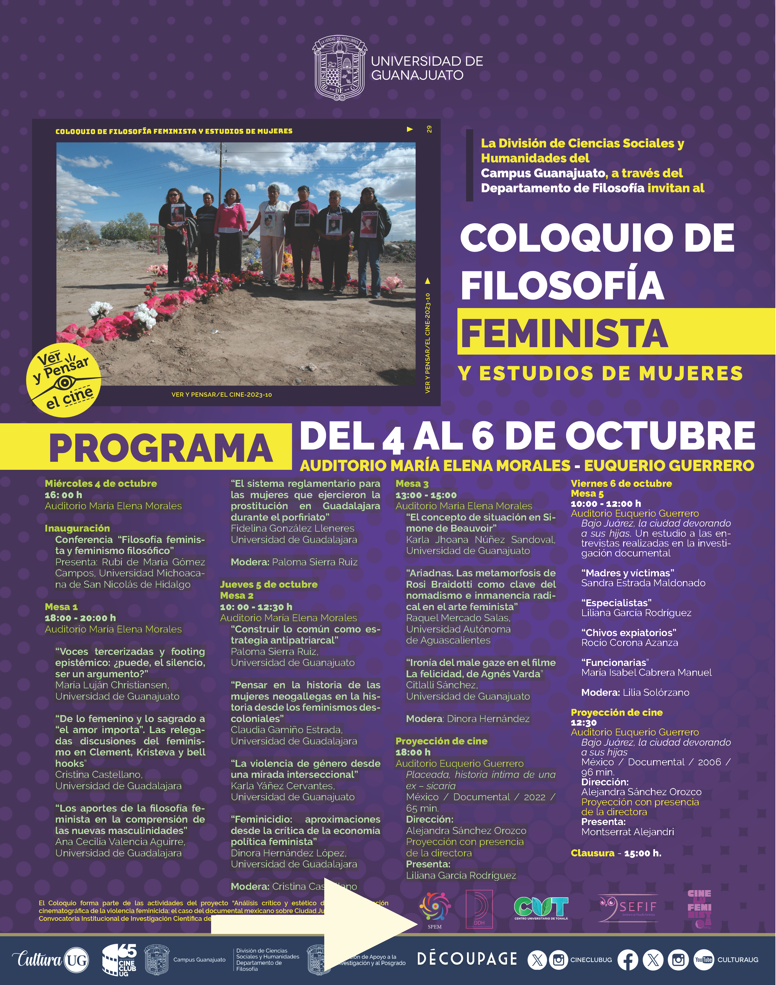 • 4 al 6 de octubre de 2023. Seminario del SPEM en el seno del Coloquio de Filosofía Feminista y Estudios de Mujeres, con apoyo de la División de Ciencias Sociales y Humanidades en la Universidad de Guanajuato. Participaron universidades del occidente del país y la realizadora mexicana Alejandra Sánchez.